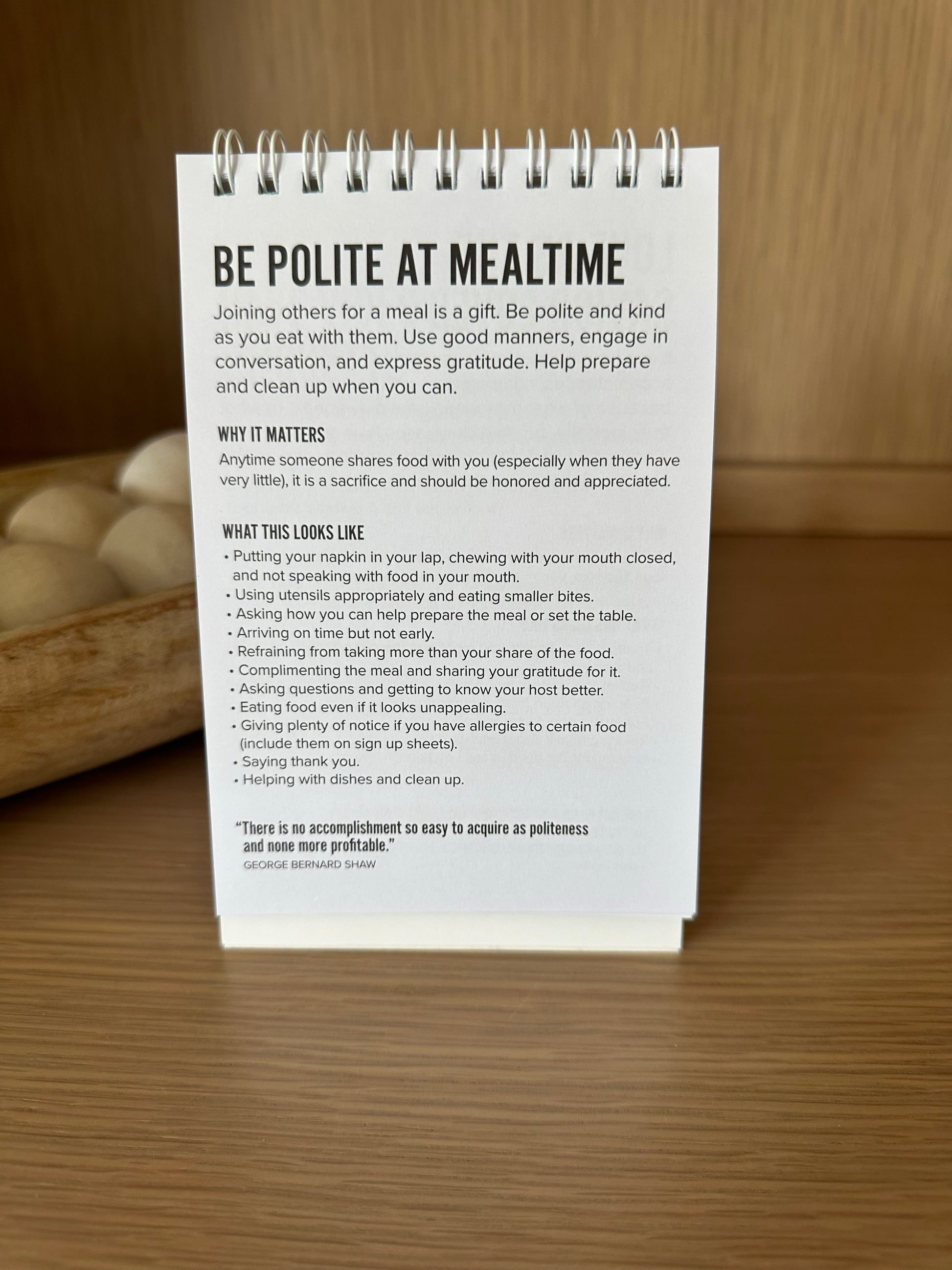 - STAND UP FLIP BOOK: Includes 55 Manners that are easily displayed.
